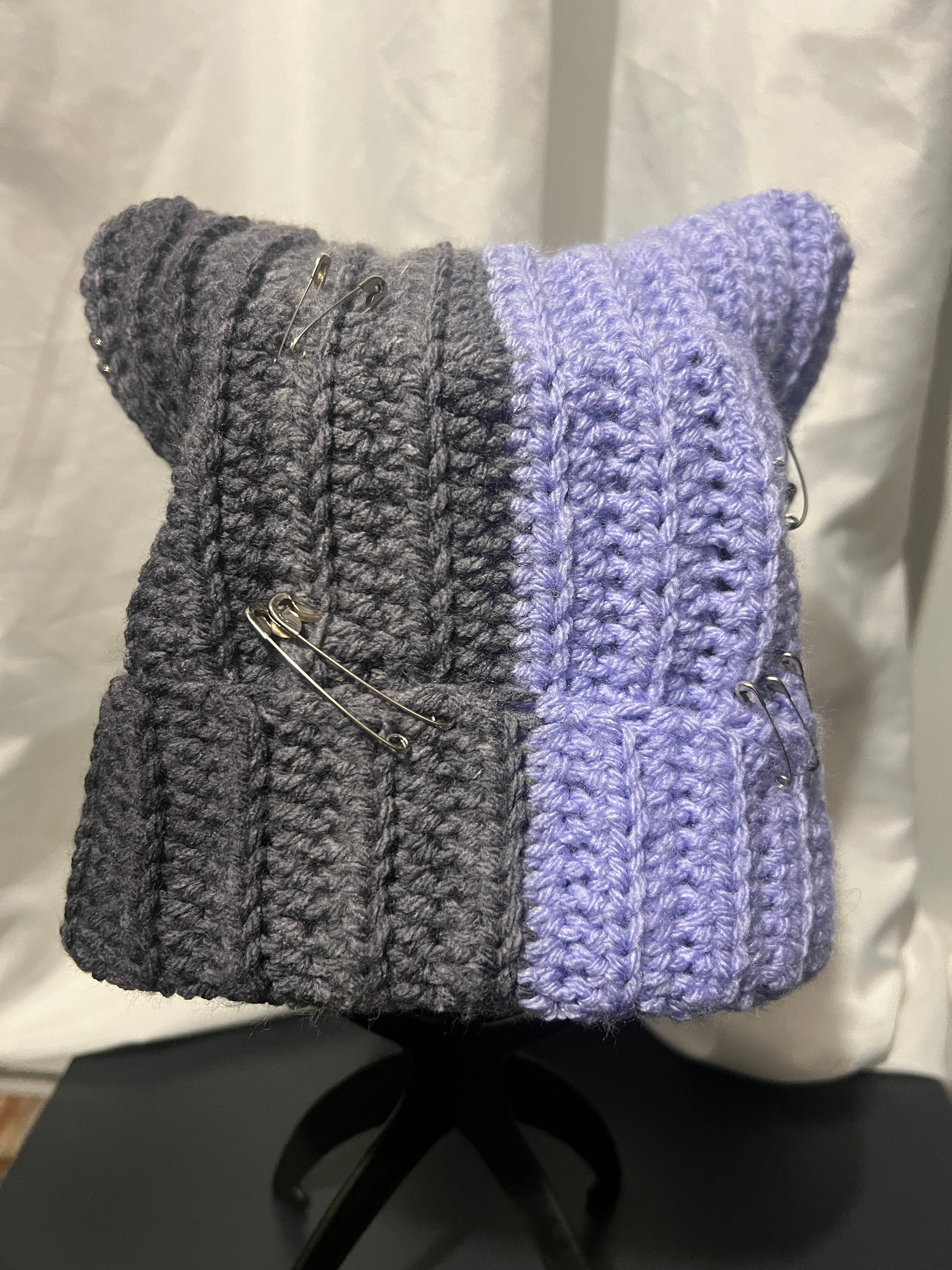 Kitty or cat ear beanie in purple and the grey is ombre, so the color fluctuates in the grey from lights and darks