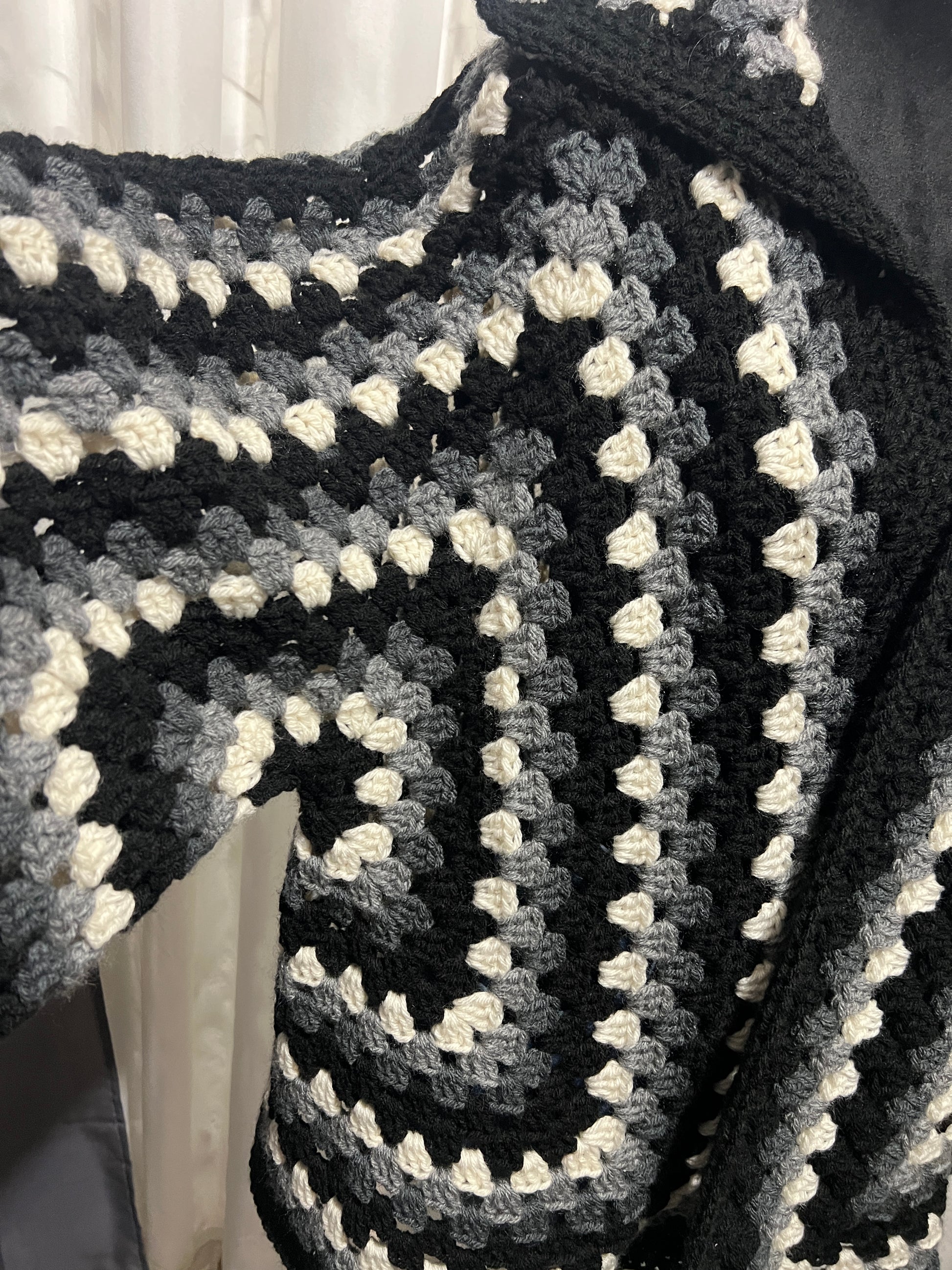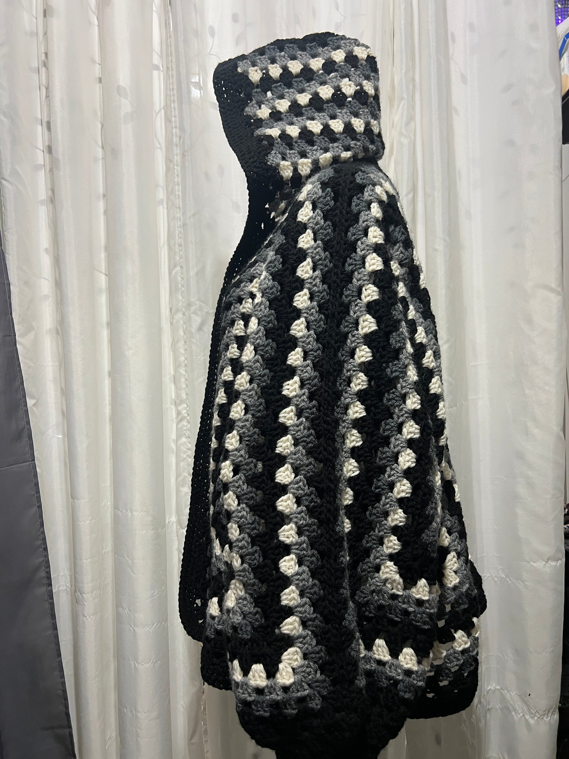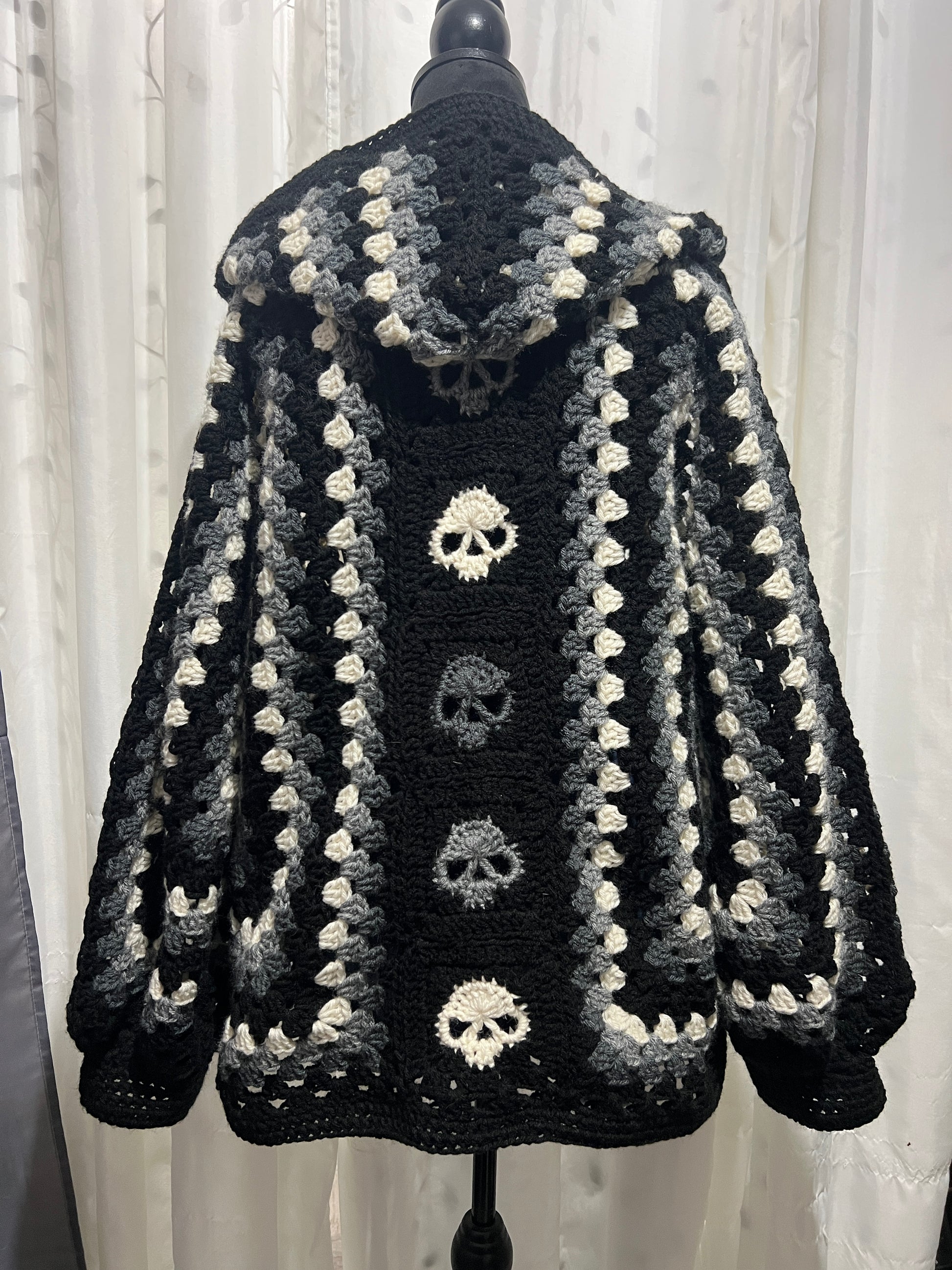Oversized skull cardigan with a hood. This has cream, light grey, dark grey and black.